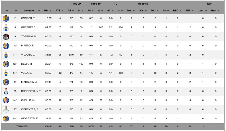 José Vildoza sentenció el triunfo xeneize con un triple y un libre, para cerrar con 25 puntos y cinco asistencias en algo más de 31 minutos. También se destacaron Martín Cuello (18 tantos, cinco rebotes) y Sebastián Vega (12 y 10).