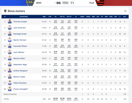 El marcador final reflejó la superioridad de Boca: 96-71. En cuanto a los máximos anotadores, Vildoza y Giorgetti sumaron 15 puntos cada uno, mientras que Scala e Ibargüen aportaron 14. Este resultado no alteró la clasificación del Grupo B, donde Flamengo ya aseguró el primer puesto y Boca el segundo. De este modo, en los cuartos de final, los brasileños enfrentarán a Paisas de Colombia, mientras que los xeneizes se verán las caras con Real Estelí de Nicaragua el próximo mes.