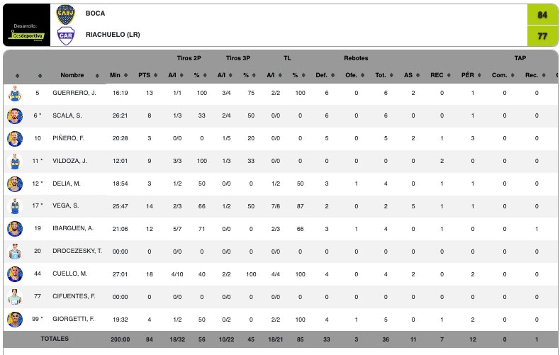 Por el lado de Riachuelo, que llegaba con el impulso de tres victorias consecutivas, el más destacado fue Juan Pablo Corbalán, quien brilló con 20 puntos. También tuvo un papel importante Reginald Becton, que aportó 15 unidades, aunque no fueron suficientes para evitar la derrota.
