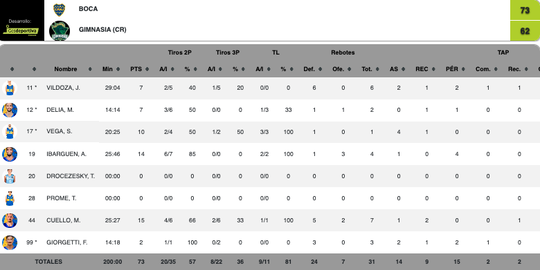 En ese contexto de paridad, el Xeneize sacó provecho de su efectividad desde la línea (81%) y del aporte clave de varias de sus figuras. Loku Cuello fue el máximo anotador con 15 puntos, además de bajar 7 rebotes y recuperar 2 pelotas. Andrés Ibargüen completó una planilla sólida con 14 unidades (85% en tiros de dos puntos) y una valoración de 15, siendo determinante en la pintura.