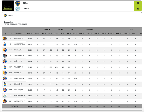 El Xeneize construyó la victoria de forma progresiva. «Loku» Cuello fue el máximo anotador con 17 puntos, mientras que Franco Giorgetti sumó 16 y Carlos «Faca» Piñero agregó otros 14. Por el lado de los misioneros, se destacaron Santiago Barreiro con 23 y Will Vorhees con 13 unidades.