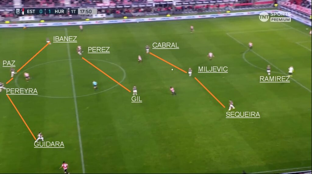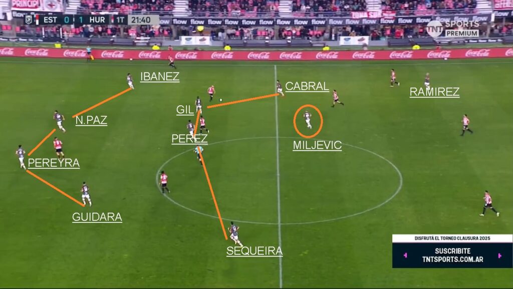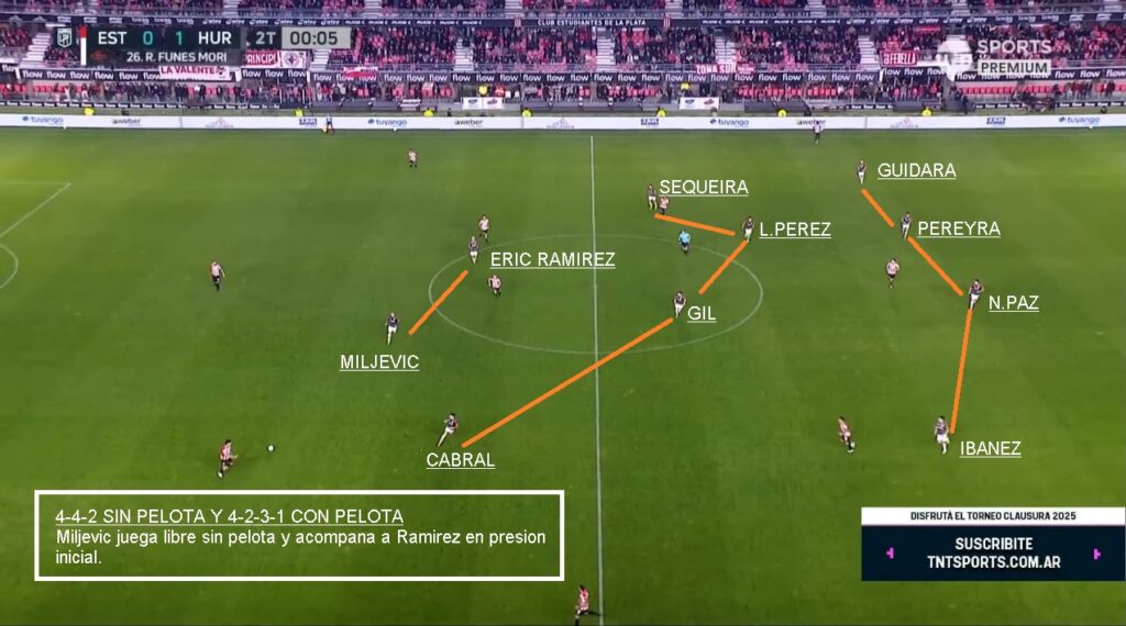 Desde principios de 2025, Frank Kudelka ha pasado a usar un sistema más definido 4‑2‑3‑1 en Huracán, con Matko Miljevic jugando como mediapunta más suelto detrás del delantero. En fases ofensivas actúa libre, alimentando juego y asociándose tanto por dentro como por fuera, más alejado de las tareas exclusivamente defensivas clásicas del doble pivote. La llegada de Leonardo Gil consolidó el doble cinco, dando equilibrio defensivo. Miljevic, con su perfil creativo, encaja mejor como enlace por detrás de la punta. El cambio busca combinar control del mediocampo con mayor llegada ofensiva sin rota estructuras defensivas.