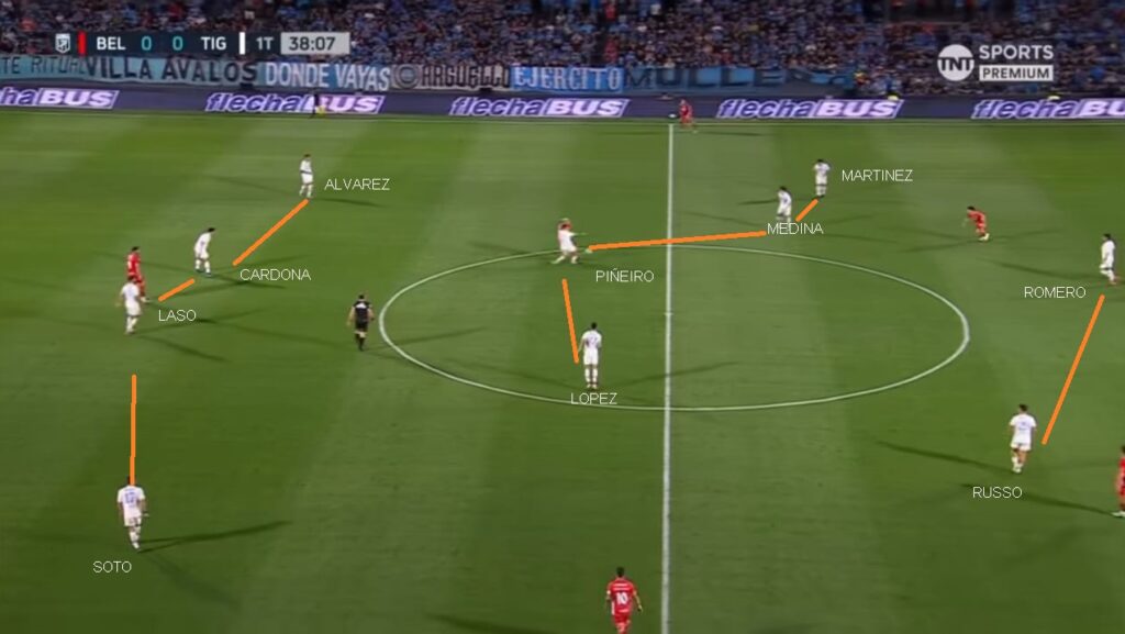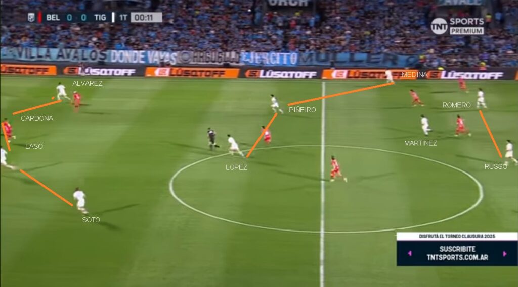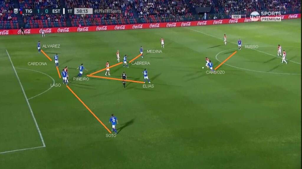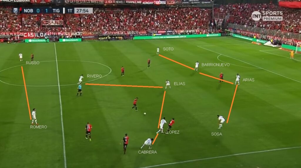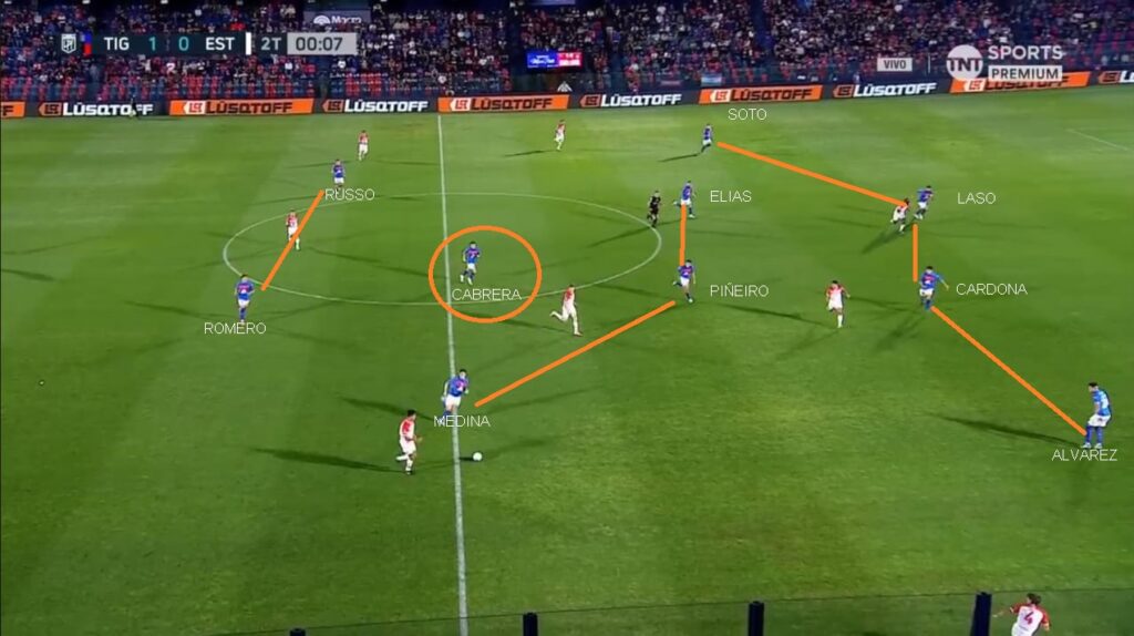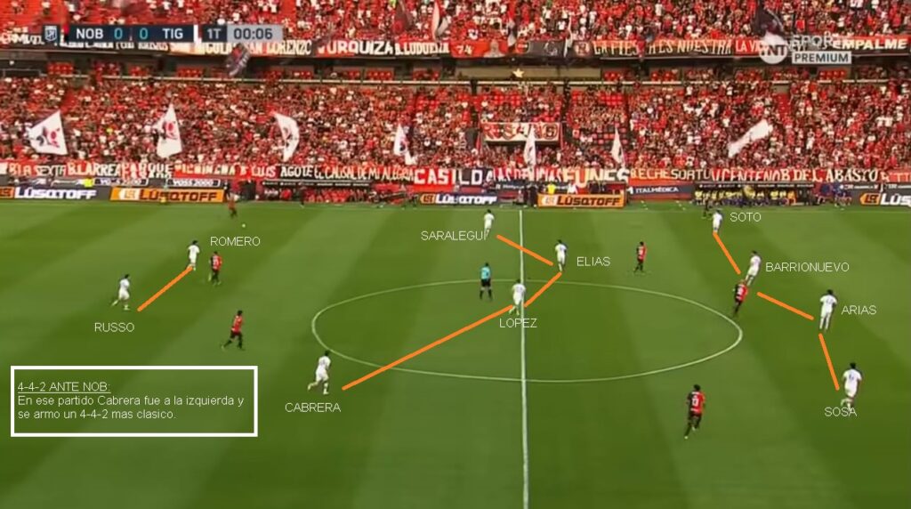 Los equipos de Dabove son siempre muy competitivos. Equipos agresivos, intensos, que no tienen tanta posesión, pero que no por eso dejan de atacar. Hoy suele jugar en un 4-3-1-2. La línea de 4 de Soto, Laso, Cardona y Álvarez se suele repetir. En el medio puede arrancar Jalil Elías por derecha o sino Julián López. El 5 también ha cambiado entre Piñeiro, Leyes u otro y por izquierda suele aparecer Medina, aunque antes ha aparecido Cabrera. Medina es quien da profundidad por izquierda, mientras que por derecha la profundidad la da Soto, ya que el volante por derecha suele cerrarse. Arriba dos delanteros potentes y rápidos. Ignacio Russo como el goleador y Romero con toda la potencia para jugar a la contra. Si tiene espacio, puede correr y lastimar, por su velocidad y potencia. Un equipo que irá a la bombonera a esperar, pero siempre buscando el error y salir rápido.