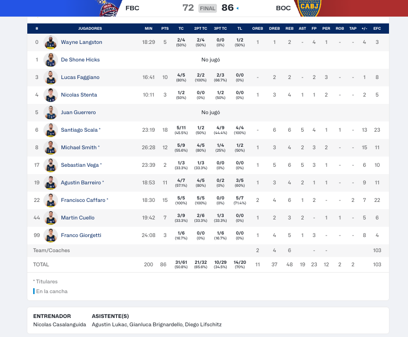 Por su parte, Santiago Scala lideró la ofensiva con 18 puntos y aportó claridad en la conducción con cinco asistencias, siendo clave en los momentos decisivos del partido.